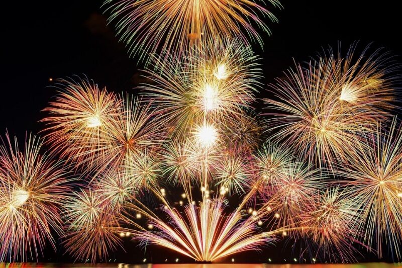海上から打ち上げられるいくつもの花火は迫力満点、夏の夜空を鮮やかに彩ります!